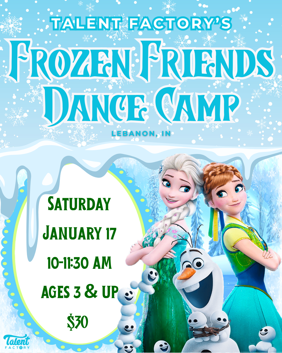 Join us for a magical Frozen-inspired adventure at our Frozen Friends Dance Camp! Embrace the winter wonderland with Elsa, Anna, and everyone’s favorite snowman, Olaf! Dancers are invited to twirl through the snowy choreography, sing along to Frozen tunes, warm up in Olaf’s fun obstacle course, and make a Frozen craft!