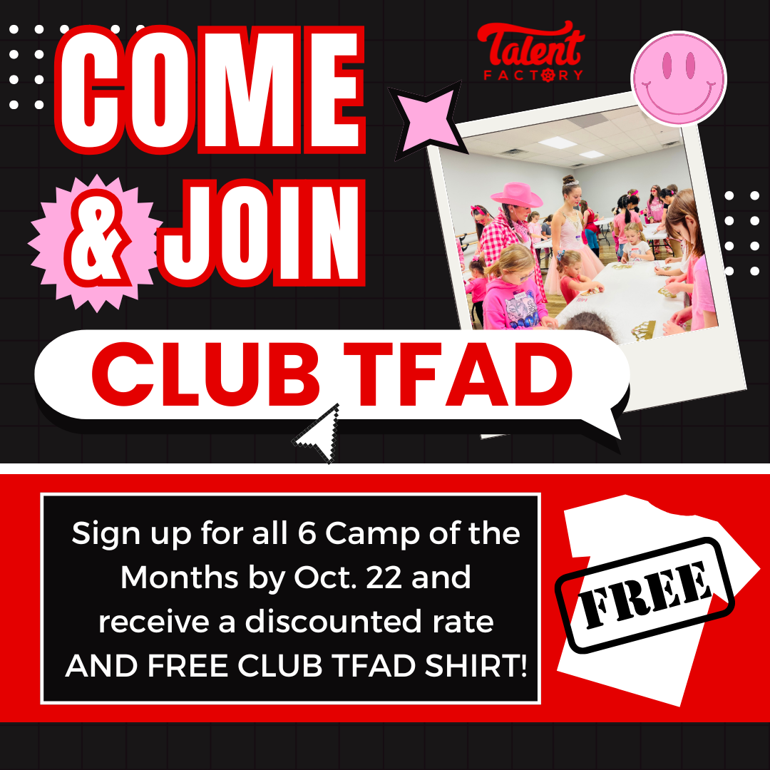 Join CLUB TFAD for an exclusive rate- only $150 for all 6 camps (regularly $180) when you sign up for ALL camps by OCTOBER 22, plus get a FREE CLUB TFAD shirt!